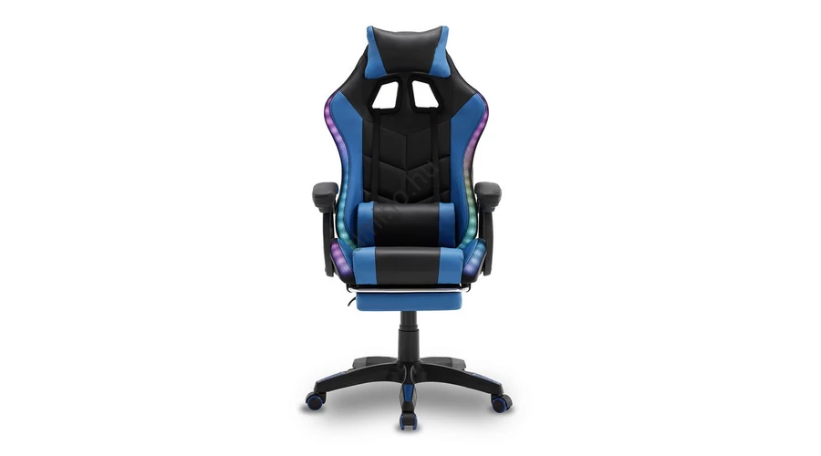 Zelux RGB LED-es gamer szék párnával, karfával, hintafunkcióval és lábtartóval - kék-fekete színben